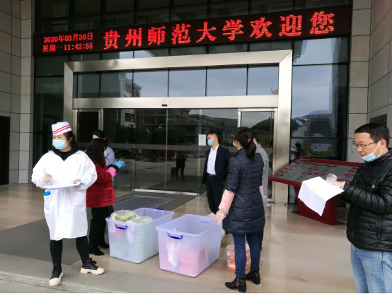 两个支部20余名党员,分成三个小组,与后勤服务集团饮食服务中心的职工们一起,为当天花溪校区返岗工作的行政楼主楼、东楼、法学院、经济与管理学院近200名教职工派送午餐。
