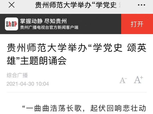 贵州广播电视台动静新闻客户端报道:贵州师范大学举办“学党史 颂英雄”主题朗诵会