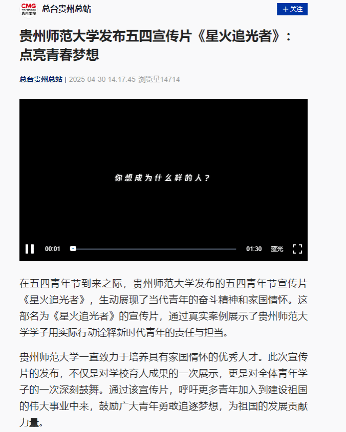 详见:贵州师范大学发布五四宣传片《星火追光者》:点亮青春梦想 (cctv.com)